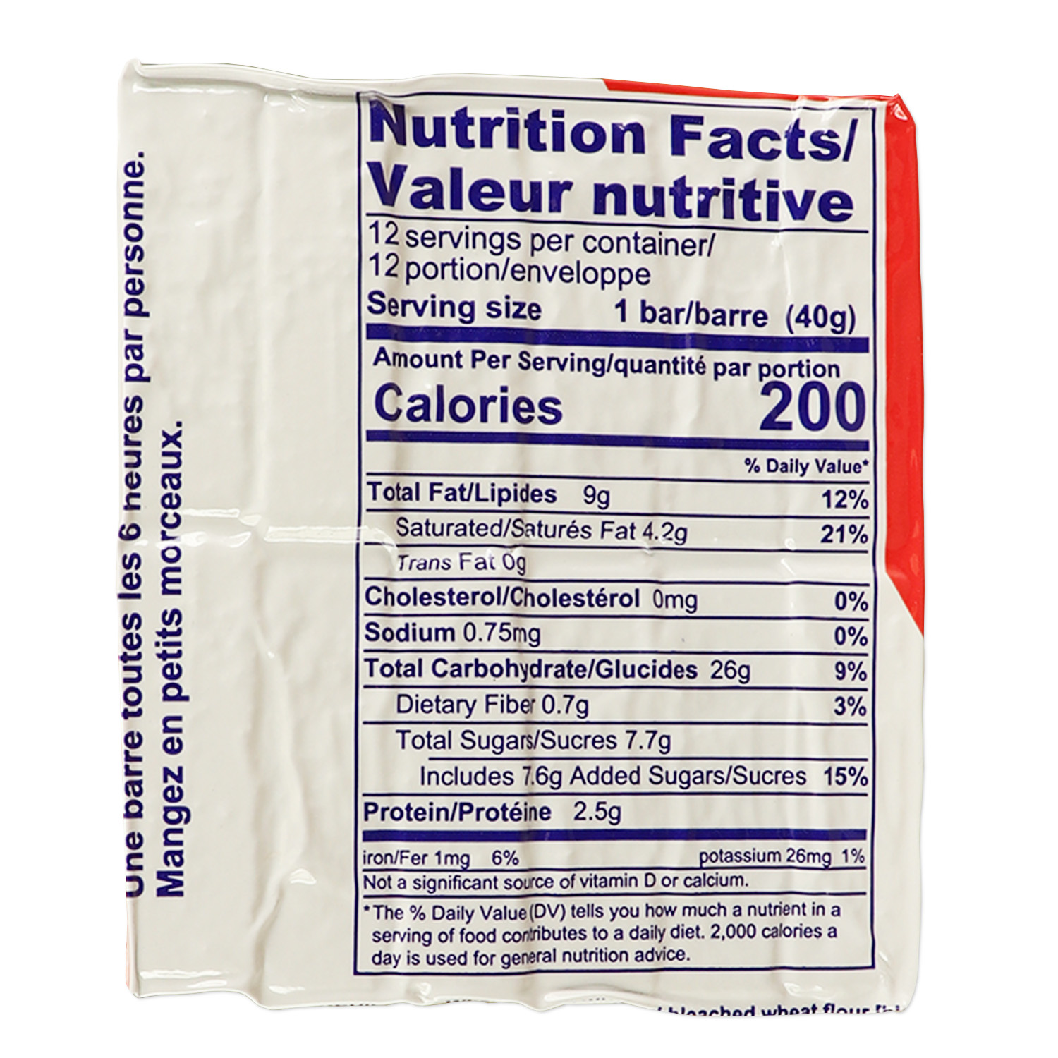 Adequate daily food is essential to surviving any emergency or disaster. These 2400 Calorie Food Bars were made with survival situations in mind and are perfect to ensure your body is getting at least 800 calories worth of fuel per day. Each pack contains 6 individual bars, each containing 400 calories and taste like shortbread cookies. They have a shelf life of up to 5 years so they'll stay fresh even if you don't use them right away. You can store these bars just about anywhere without worrying about spoilage or temperature control.   Ingredients: Wheat Flour (enriched bleached wheat flour [bleached wheat flour, niacin, reduced iron, thiamine mononitrate, riboflavin, folic acid], malted barley flour), Vegetable Shortening (Palm Oil), Cane Sugar, Water, and Natural Coconut Flavoring.